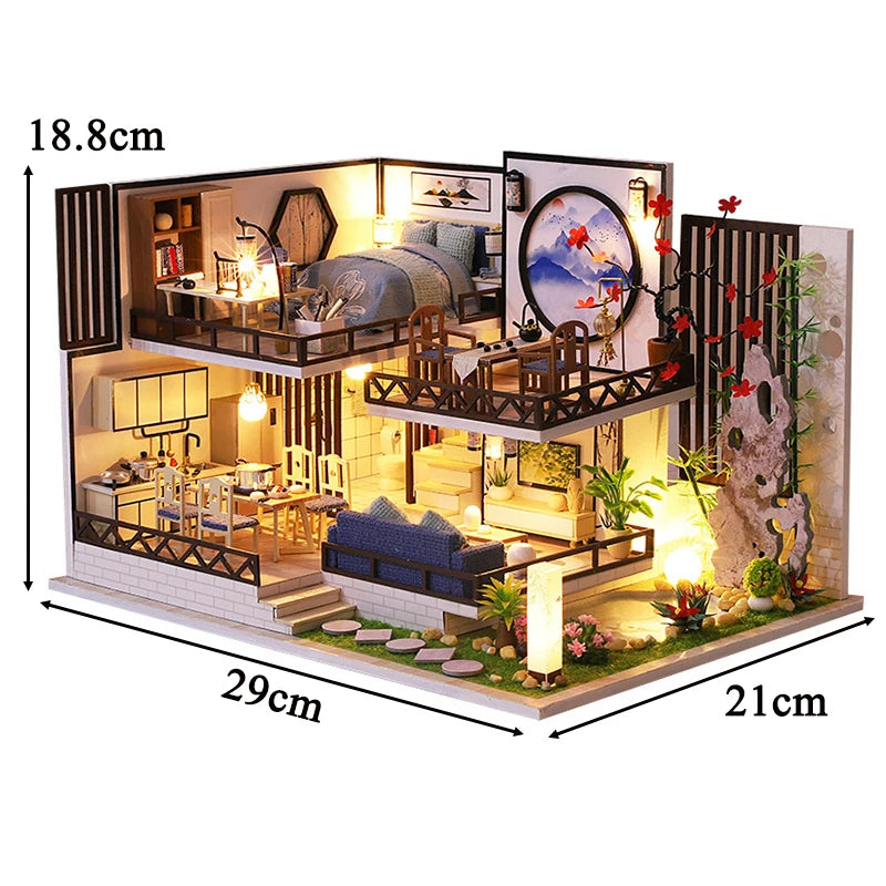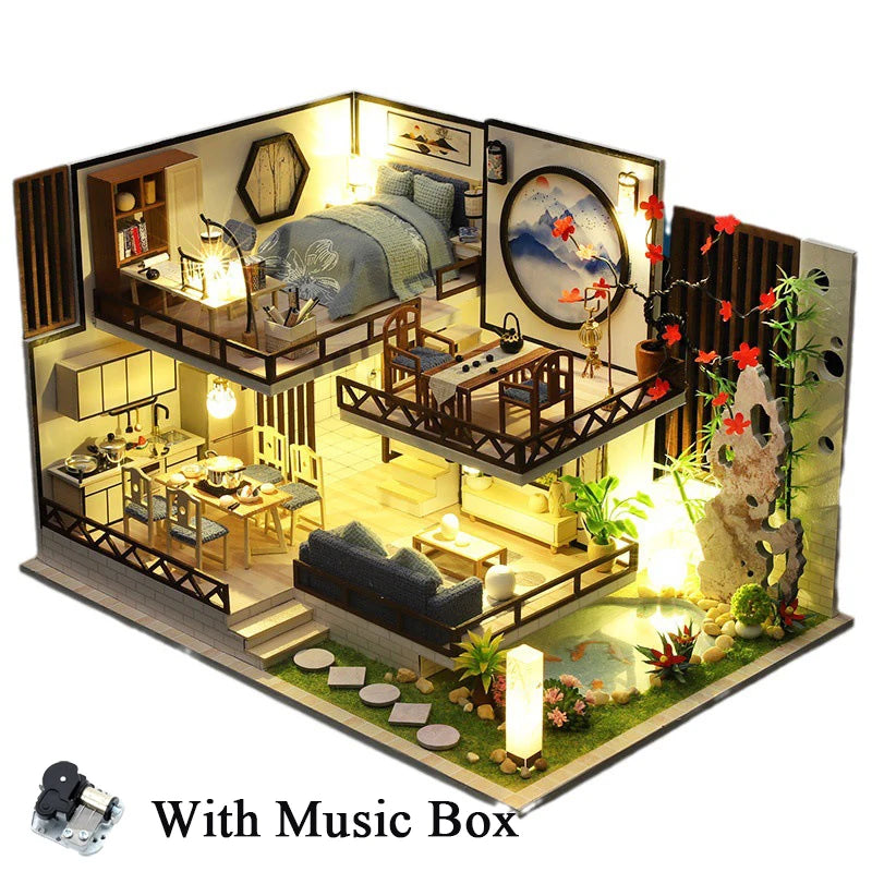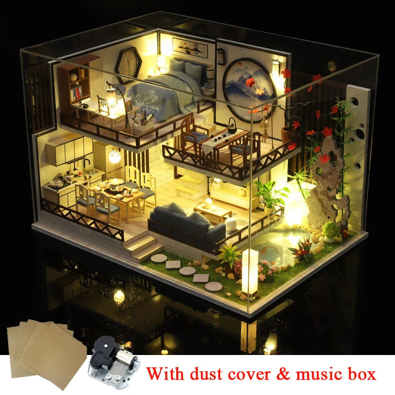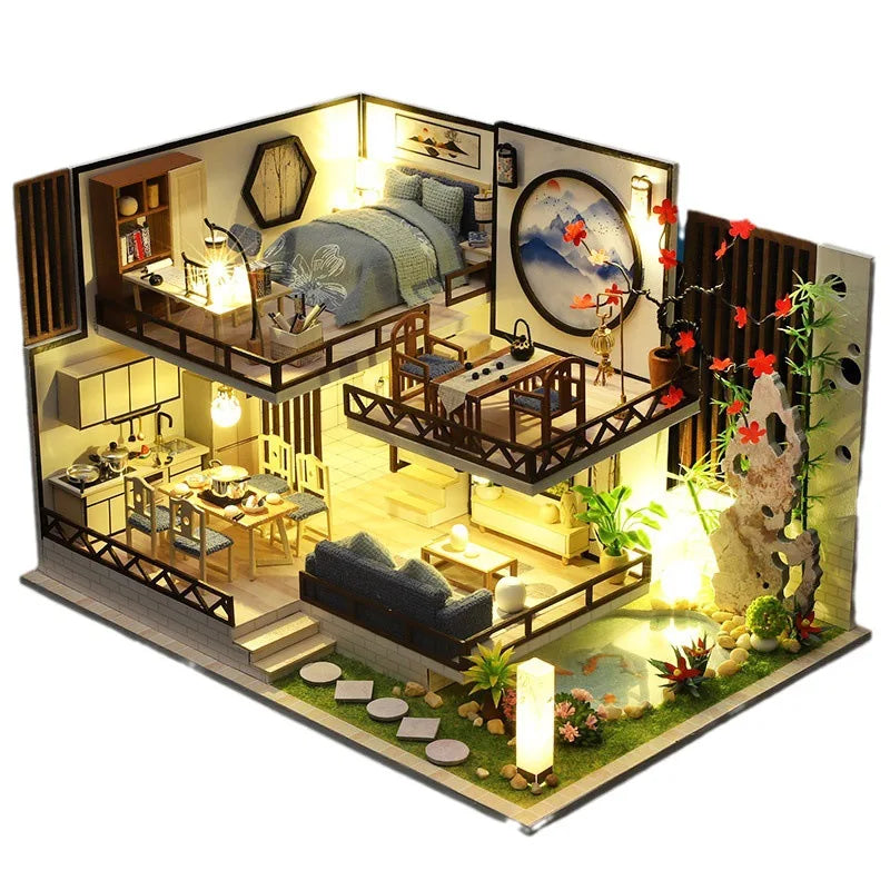DIY Wooden Miniature Model Kit – Japanese Bamboo Cottage 3D Puzzle Villa Dollhouse with Furniture & Lights – Perfect Gift for Friends & Home Decor
